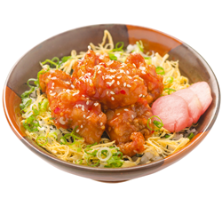 Курица, рис, чеснок, нори, яйцо, зеленый лук, кунжут, маринованный редис, крахмал, масло кунжутное, соус «Чин-су», соус «Тобанджан», соус«Донбури».