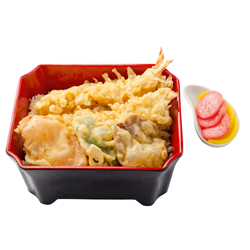 Креветки, рис, грибы «Шиитаке», морковь, перец болгарский, мука, кляр, маринованный редис, такуан, соус «Донбури».