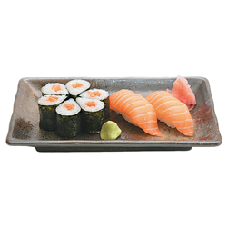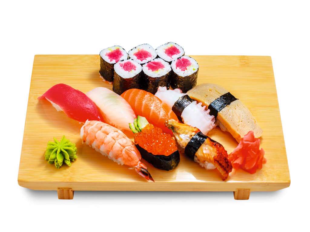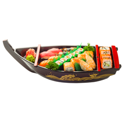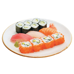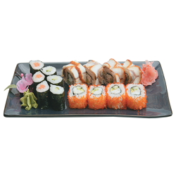 Суши: тунец, лосось, угорь, креветка; спайси гункан: лосось, тунец, угорь, креветка, гребешок; ролл «Филадельфия», ролл с лососем.