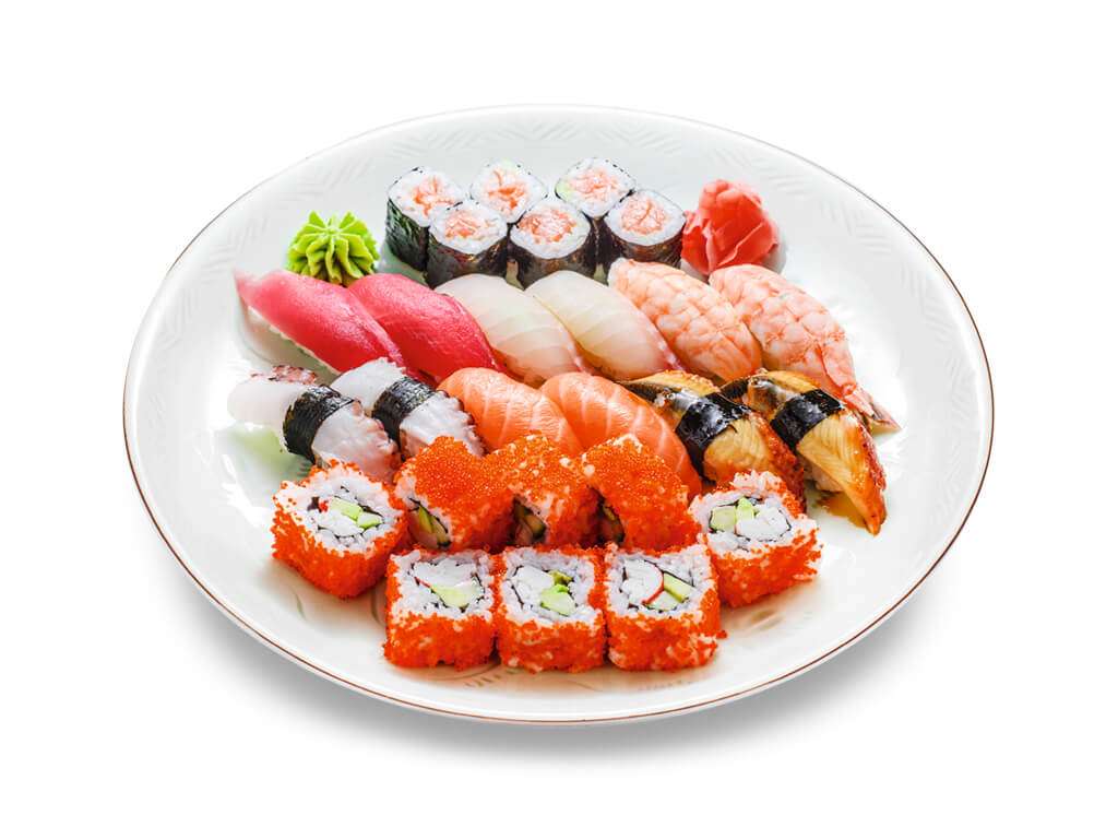 Суши: тунец, лосось, угорь, креветка; ролл «Калифорния», ролл «Филадельфия», ролл с лососем.