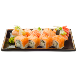 Суши: лосось, обжаренный лосось, салмон чиз онион, салмон маё онион, салмон авокадо онион; ролл «Филадельфия».