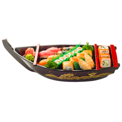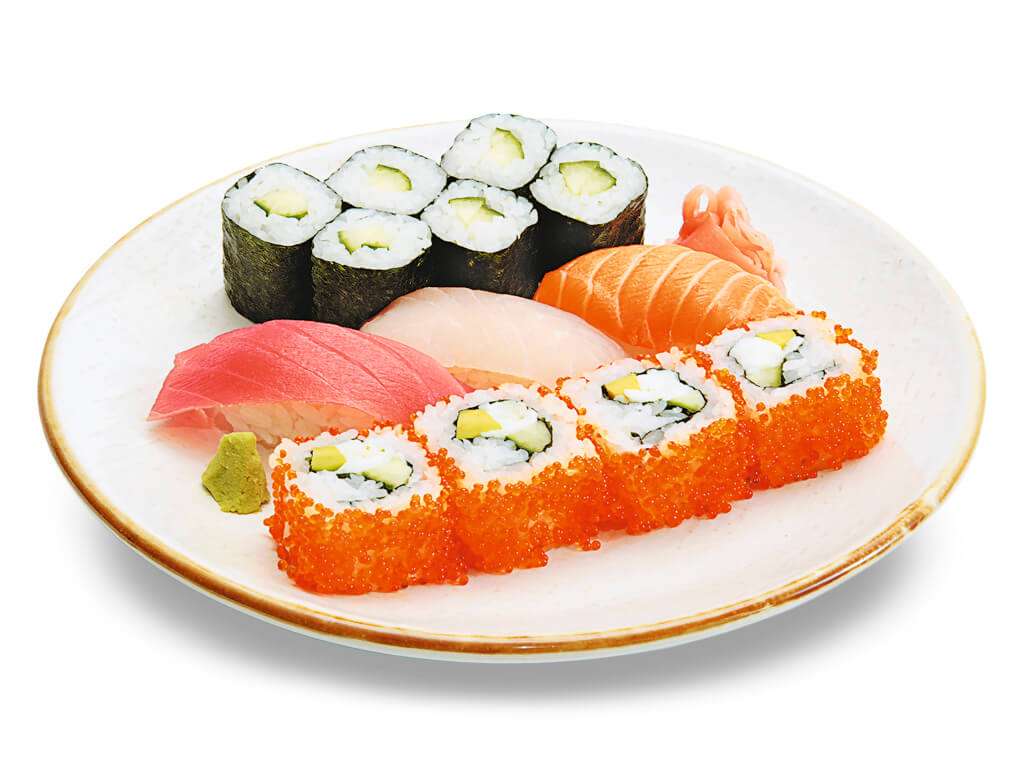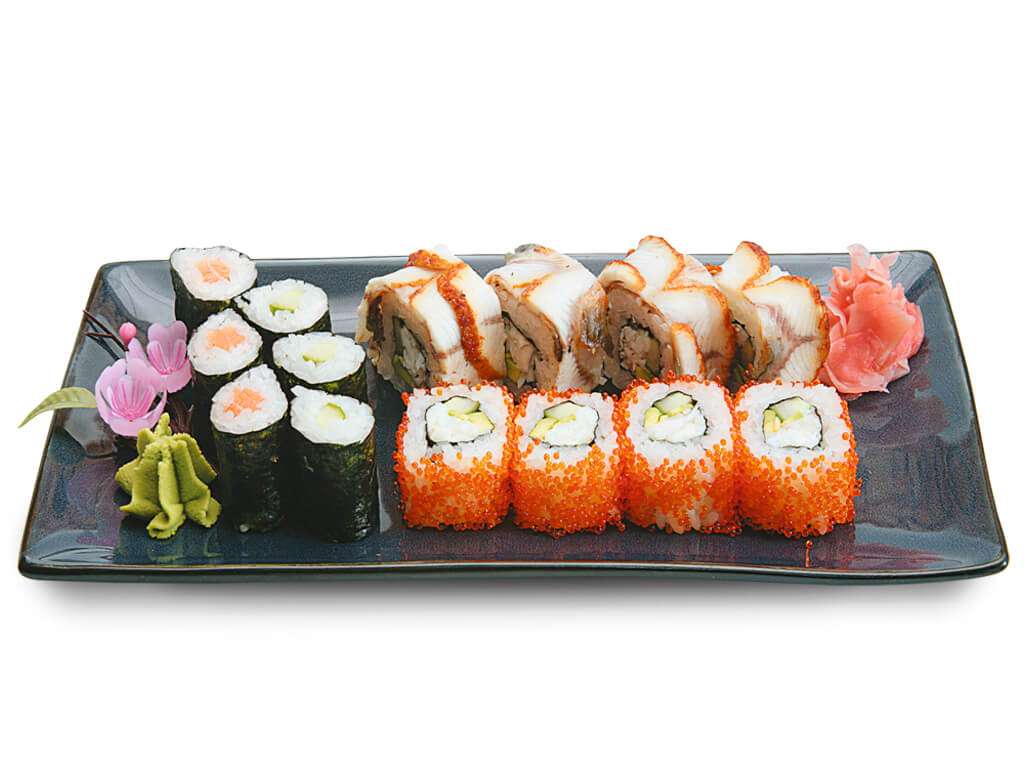 Суши: тунец, лосось, угорь, креветка; ролл «Калифорния», ролл «Филадельфия», ролл с лососем.