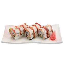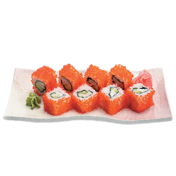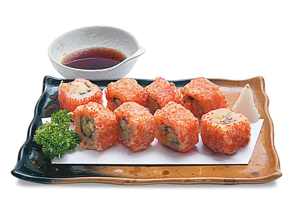 Мясо краба, авокадо, огурец, тобико, майонез, дайкон, корень имбиря, соус «Темпура».