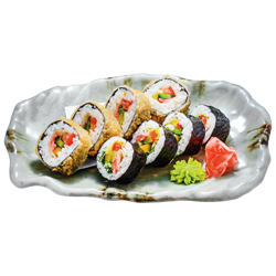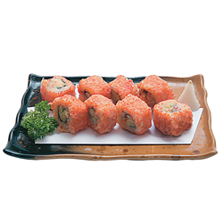 Крабовые палочки, авокадо, огурец, тобико, майонез, дайкон, корень имбиря, соус «Темпура».